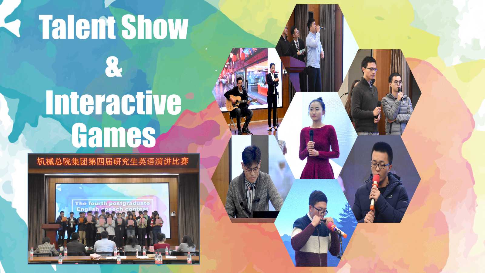 比賽間歇,來自材保所的張博聞表演了精彩的《帶你走進西班牙足球》英文配音,來自輕量化院的閆丹丹和劉曉軍帶來了英文版吉他伴唱《成都》,來自機科股份的陳展帶來了動聽的口琴曲《愛爾蘭畫眉》,來自輕量化院的郭子桐演唱了英文歌曲《Nothing`s Gonna Change My Love For You》,讓大家在緊張的比賽氛圍中感受到輕松與愉悅。此外,“電影配音”、“英語繞口令”、“Describe and guess”等一系列小游戲活躍了現場氣氛。