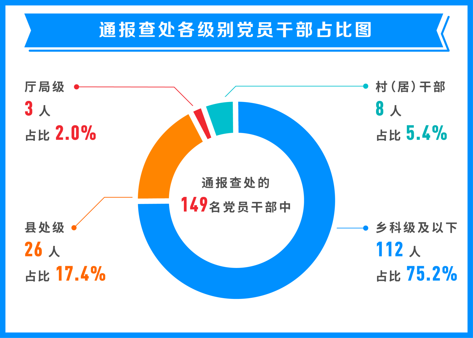 從處理各級別黨員干部人數(shù)看,通報的58起典型問題,查處的149名黨員干部中,村(居)干部8人,占全部人數(shù)5.4%;鄉(xiāng)科級及以下112人,占全部人數(shù)75.2%;縣處級26人,占全部人數(shù)17.4%;地廳級3人,占全部人數(shù)2.0%。通報數(shù)據(jù)印證,重點整治群眾身邊特別是群眾反映強烈的形式主義、官僚主義突出問題十分必要。